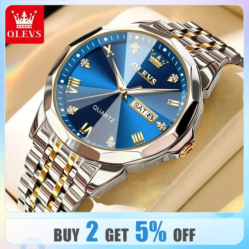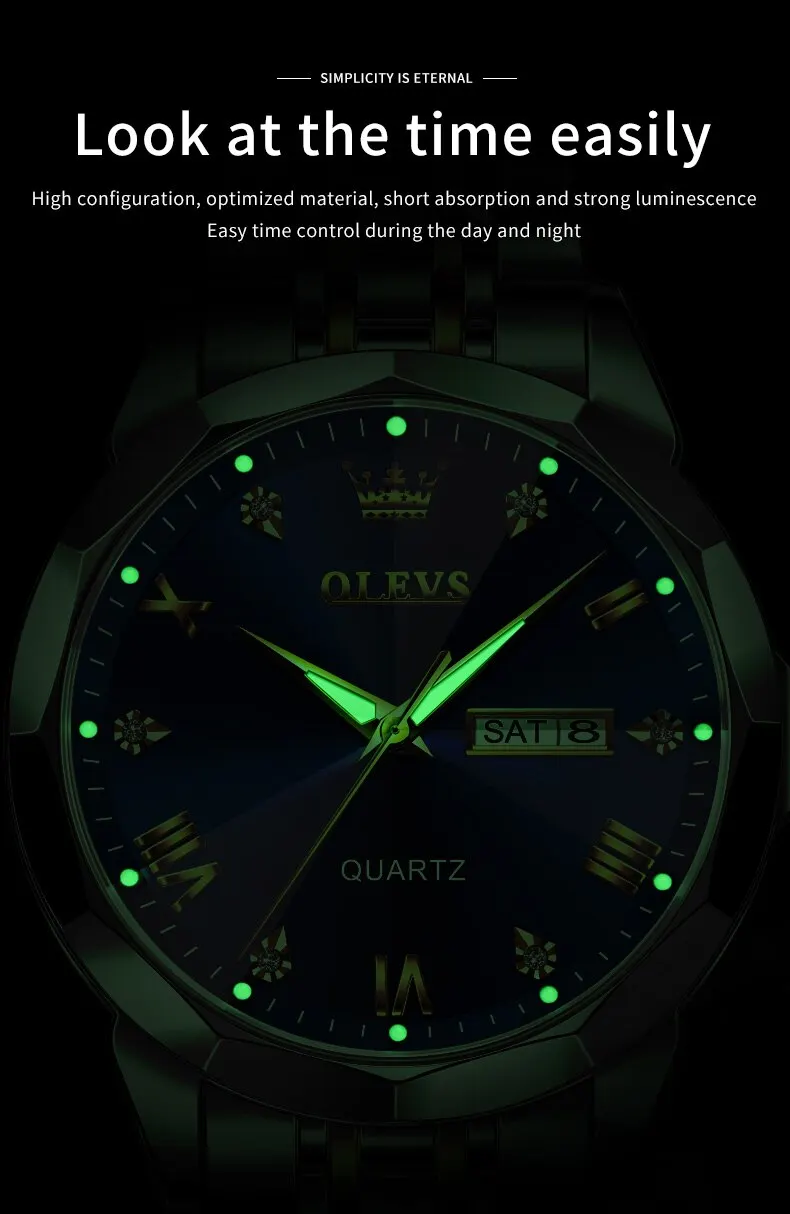 ساعة OLEVS للرجال بمرآة رومبوس كوارتز أصلية مقاومة للماء ومضيئة من الفولاذ المقاوم للصدأ ساعة يد للرجال مع تاريخ الأسبوع