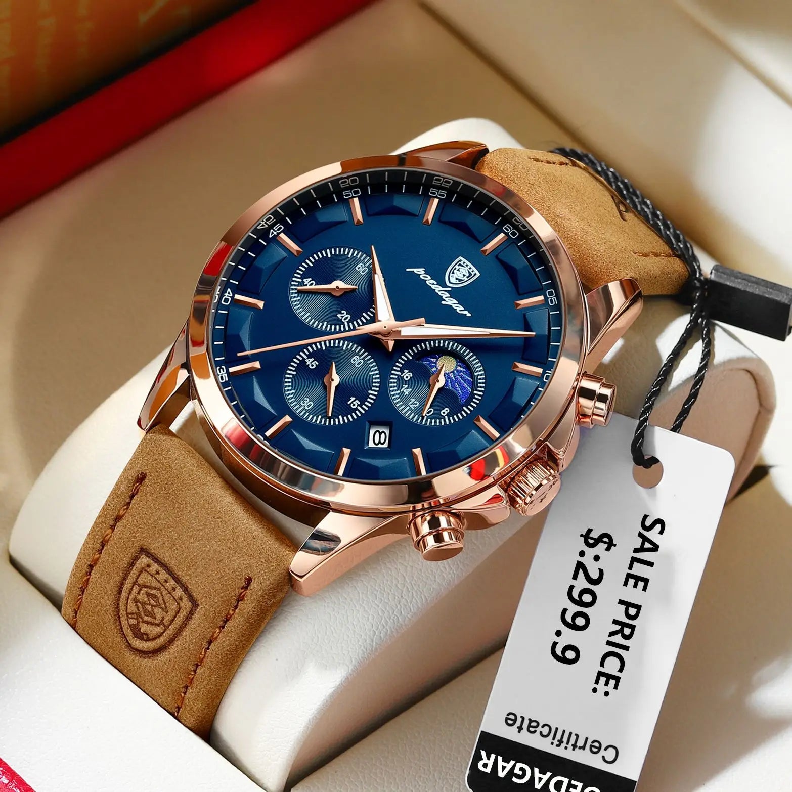 ساعة يد رياضية فاخرة للرجال من POEDAGAR مصنوعة من الجلد، كوارتز مقاومة للماء، كرونوغراف بتقويم مضيء، ساعات رجالية