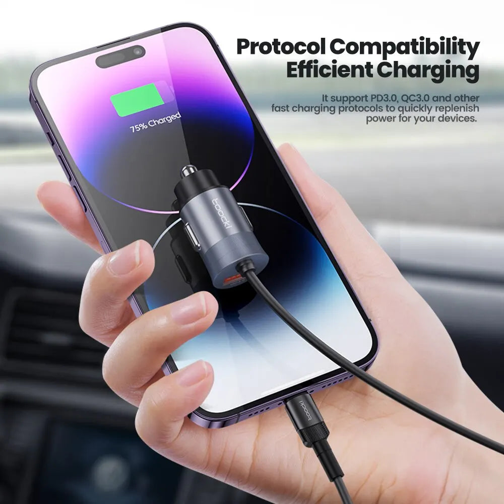 شاحن سيارة Toocki USB بقوة 65 وات، شحن سريع 3.0 4.0، شاحن هاتف للسيارة مع كابل شاشة من النوع C لأجهزة iPhone 15 14 13 12