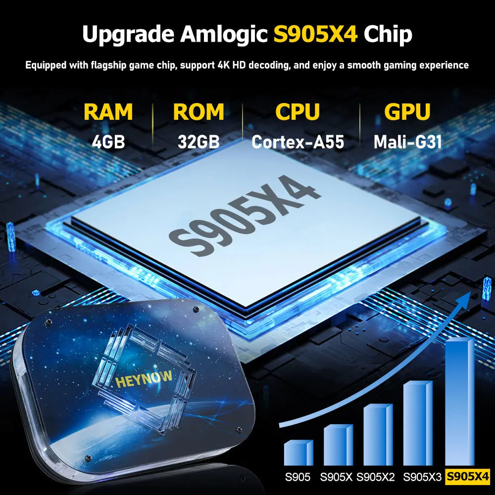 يستخدم HNX4 Arcade Box معالج Amlogic S905X4 رباعي النواة، وتأتي الرقائق مع وحدة معالجة مركزية ARM Cortec A55 رباعية النواة 64 بت، ووحدة معالجة رسومية Mail-G31 MP3 مدمجة، وأكثر استقرارًا وأكثر سرعة، وتضمن سعة التخزين الكبيرة مشاهدة التلفزيون ولعب الألعاب بسلاسة.