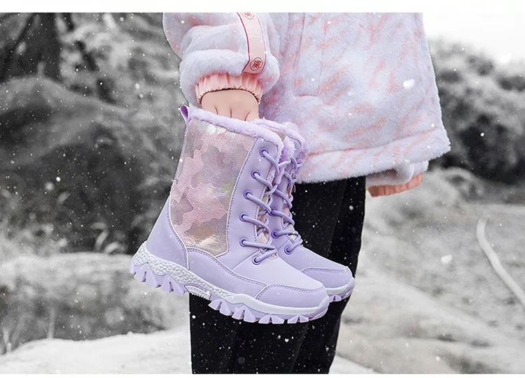 أحذية YISHEN للثلج للبنات، أحذية أطفال دافئة من القطيفة، أحذية أميرات من الفرو الدافئ، أحذية مضادة للانزلاق حتى منتصف الساق، أحذية شتوية للأطفال باللون الوردي