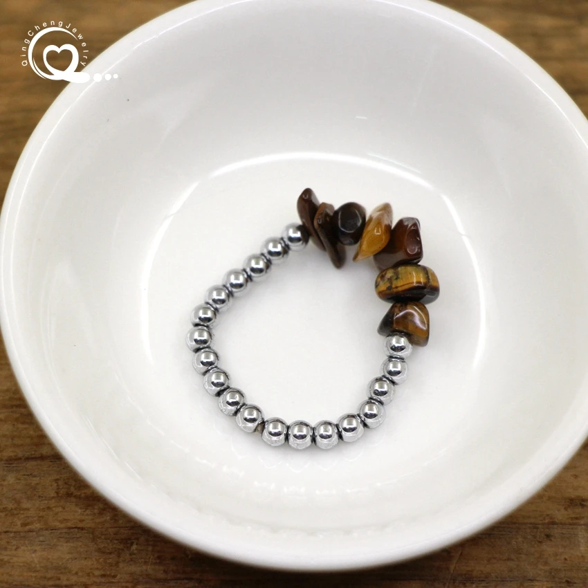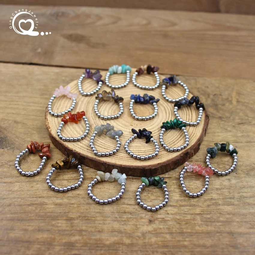Chip Gemstones Stretchy Rings Silvers Brass Round Bead Natural Stone Crystal Gravel Finger Stackable Ring Fashion Jewelry,QC4217