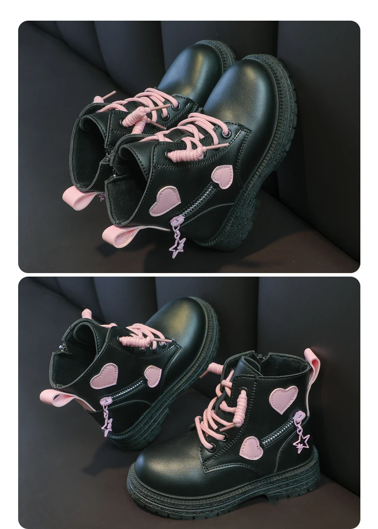 Girls Boots Kids Fashion Rubber Boots Cool Girl Autumn and Winter Cotton Soft Sole Pink with Love Side Zip Princess Round-toe PU