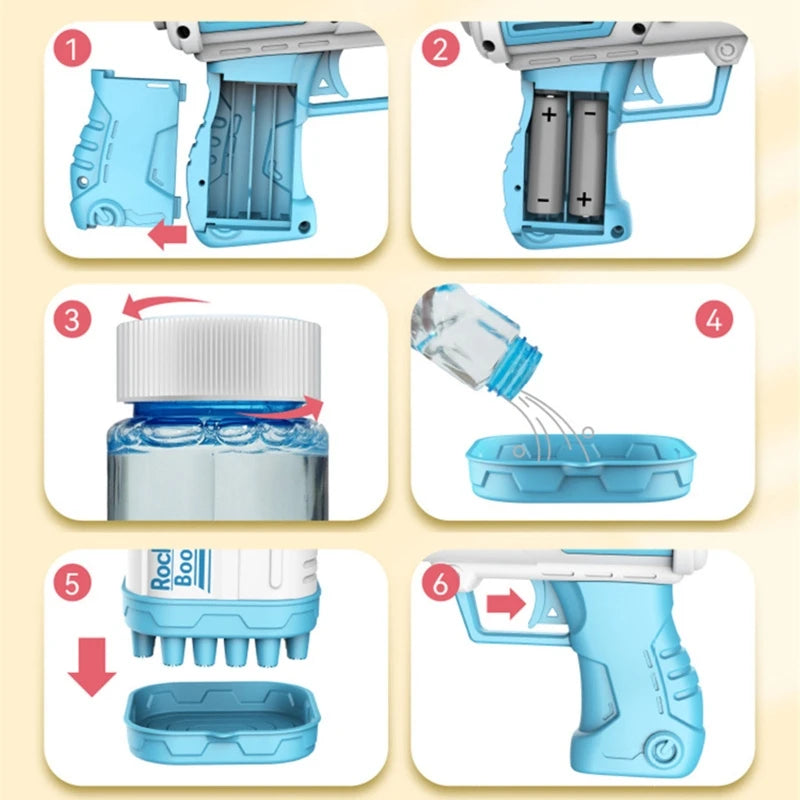 Rocket Boom Bubble Guns: Lovely rocket boom shape, combine with bubble guns together, can produce colorful and rich bubbles with equipped 32 hole blower, create a dreamlike bubble world for kids, girls, also suitable for outdoor game or wedding & parties, applicable for various circumstance.